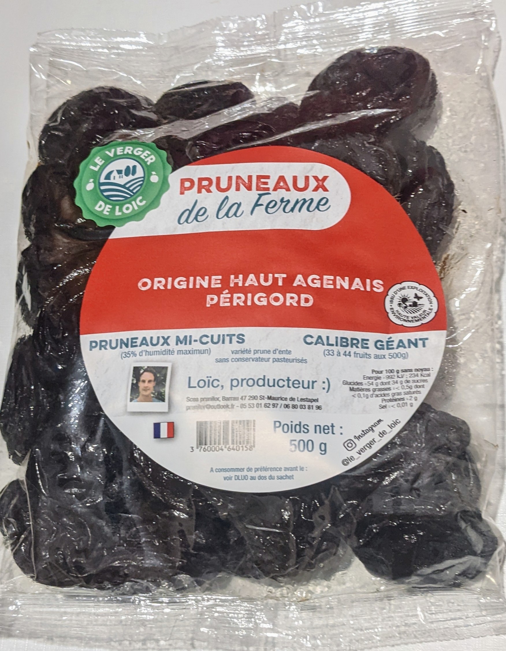 Pruneaux mi-cuits géants entiers variété prune d’Ente 500g.